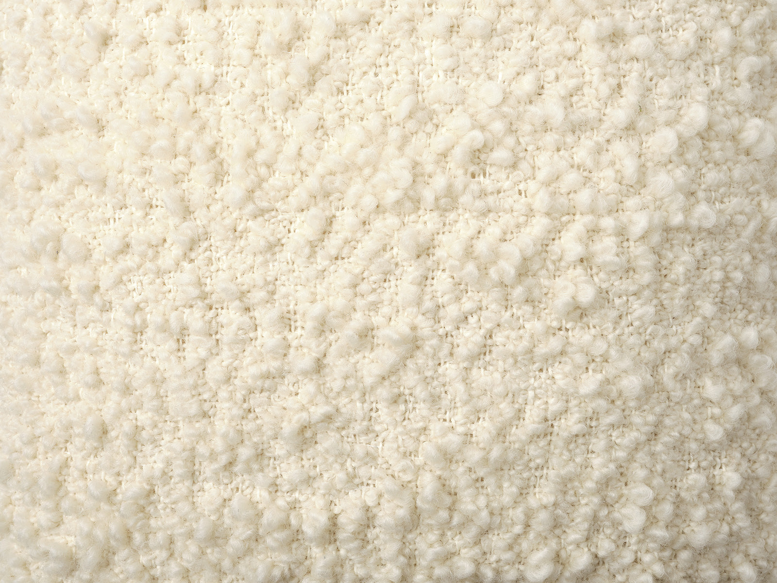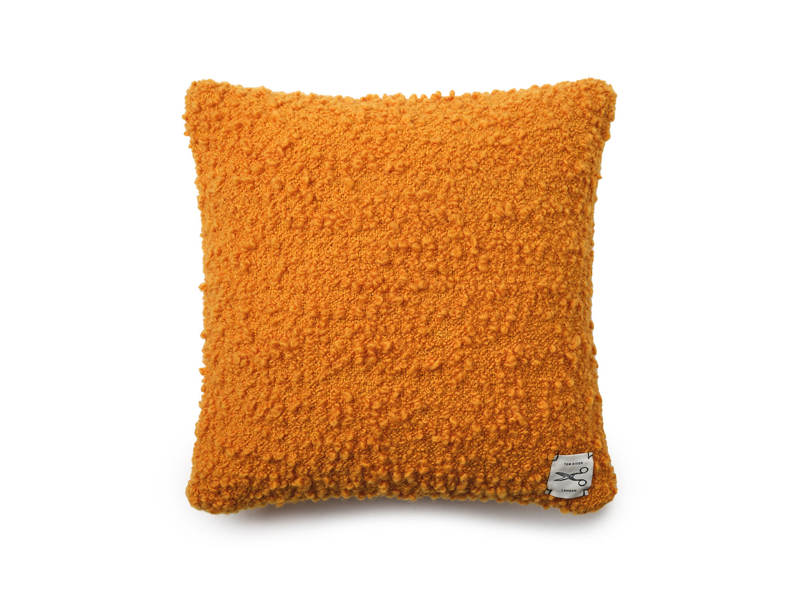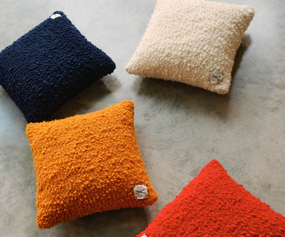 BOBBLEクッションは、ウール混ブークレの豊かな質感と色彩が空間にアクセントを加えます。ナチュラル、オレンジ、オーカー、ブルーの4色展開で、インドの熟練職人による手織り仕上げのため、ひとつひとつが個性的です。内側にはリサイクルポリエステルパッドとウール混ブークレを使用しており、ふんわり柔らかく、ソファやアームチェアに置くだけで空間を彩ります。