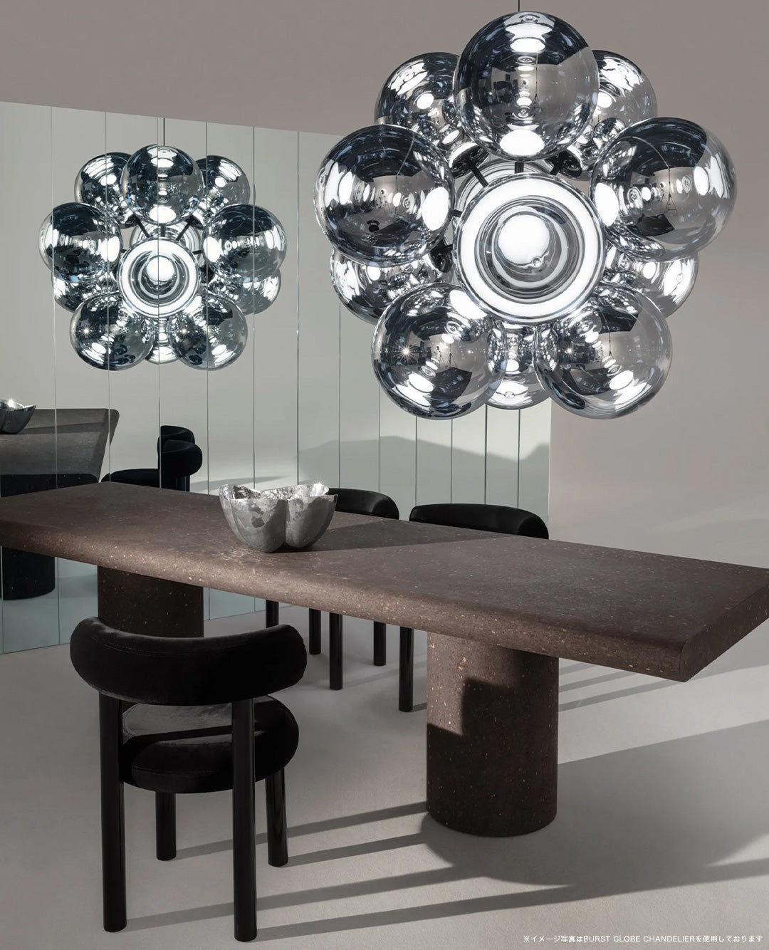 ミラーボール・バーストは、12個のポリカーボネート製のシェードと放射線状に枝分かれした照明灯具を組み合わせた照明です。その名の通り、物体が空中で破裂する瞬間を捉え、デザインに投影しました。 12個ある光源から放たれた光は、内側をメッキ塗装されたポリカーボネート製のシェードの中を駆け巡り、周囲に柔らかな光を放ちます。 消灯時は、シェードが周りの景色を反射する鏡のように変化し、空間を漂うオブジェへと変化します。