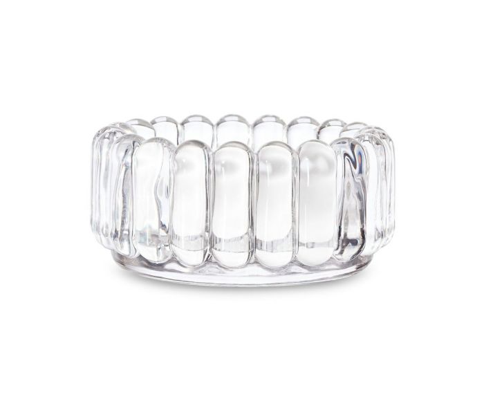 ひだ状のくぼみが重厚でインダストリアルな雰囲気を醸し出す、大胆なシルエットと簡素な機能美をあわせ持つグラス・アクセサリーのシリーズです。澄み切った透明感と厚みをあわせもつガラスをコイル状に巻いて成型したようなデザインが特徴です。 外から差し込む光を取り込み、屈折させることで、眩い光を放ちます。 摂氏1200℃に熱し、液体状にしたガラス原料を幾つかの金型に分け冷却、成形することで、無骨ながら、どこか親しみのあるシルエットが実現しました。