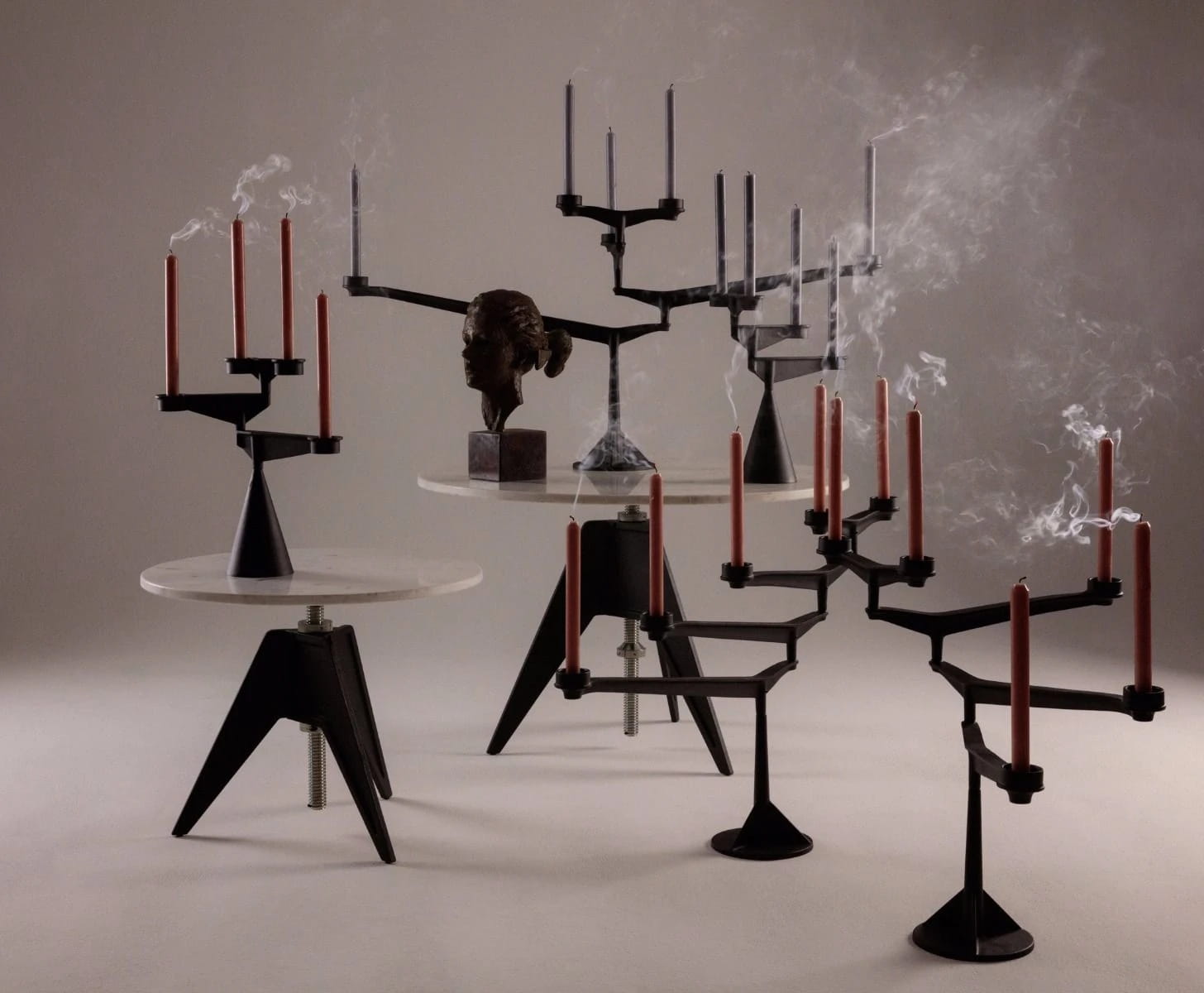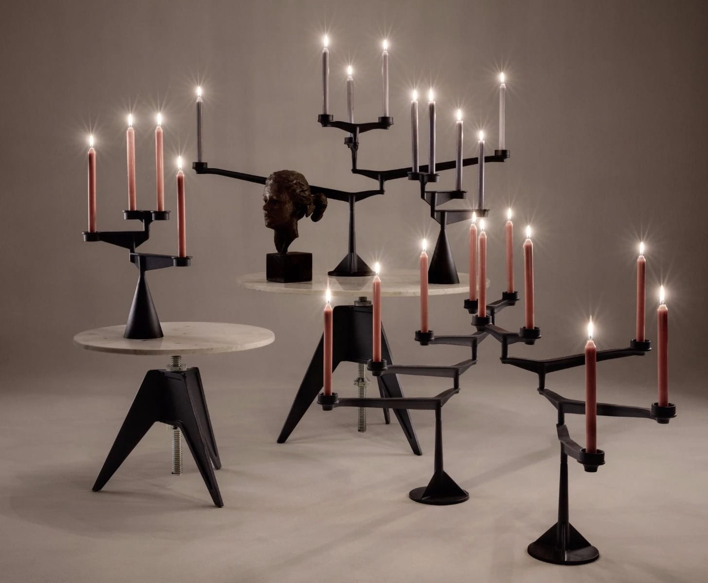 堅牢で重厚感のある鋳鉄で作られたキャンドルホルダー。 鋳鉄の本体は黒色のパウダーコーティングを施しています。4本のキャンドルを3本のアームに置くことができます。アームはそれぞれ回転させることができるため、フォルムをスペースやシーンに合わせ自由に変えられます。テーパードキャンドル、ティーライトキャンドルどちらのタイプもお使いいただけます。