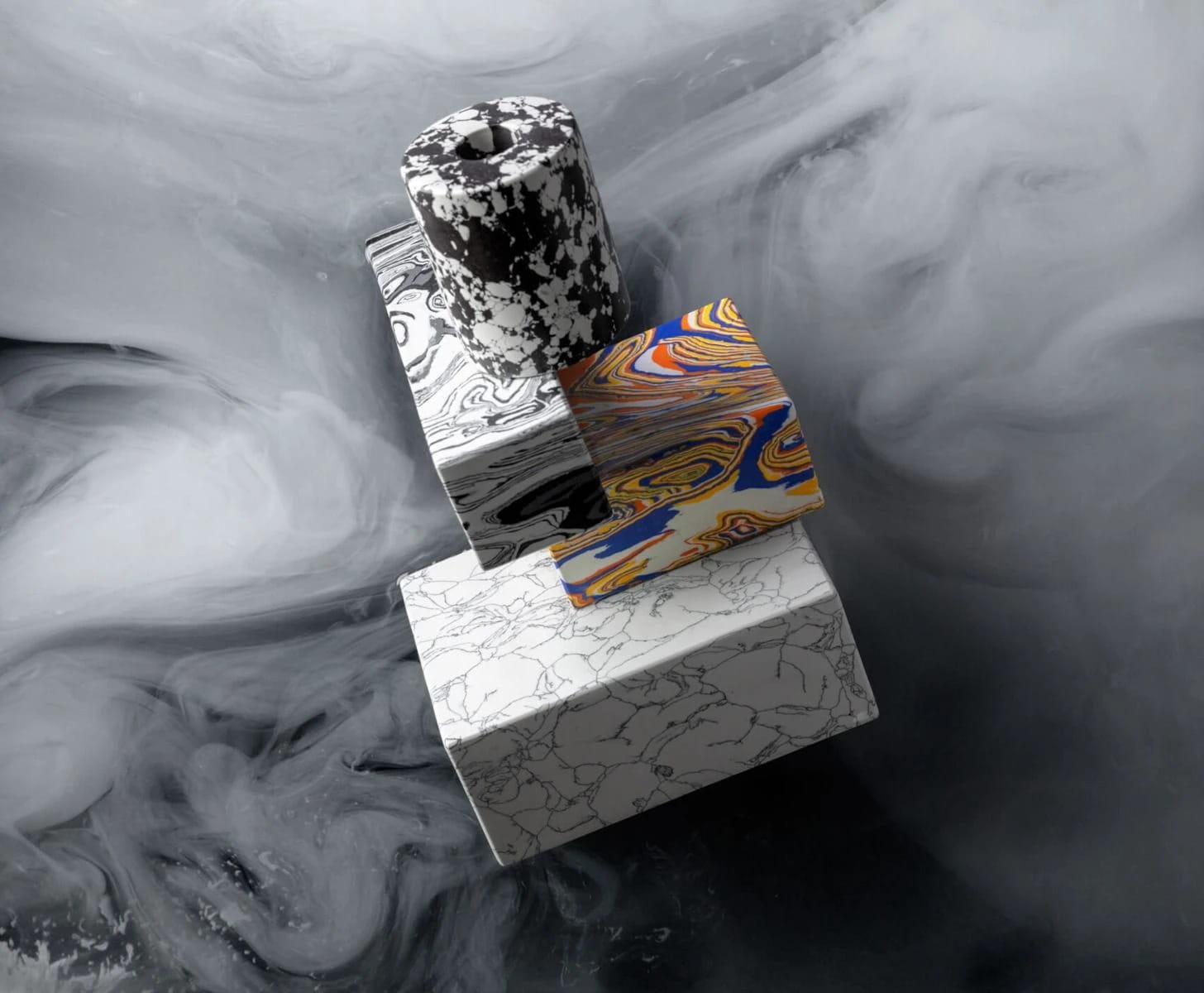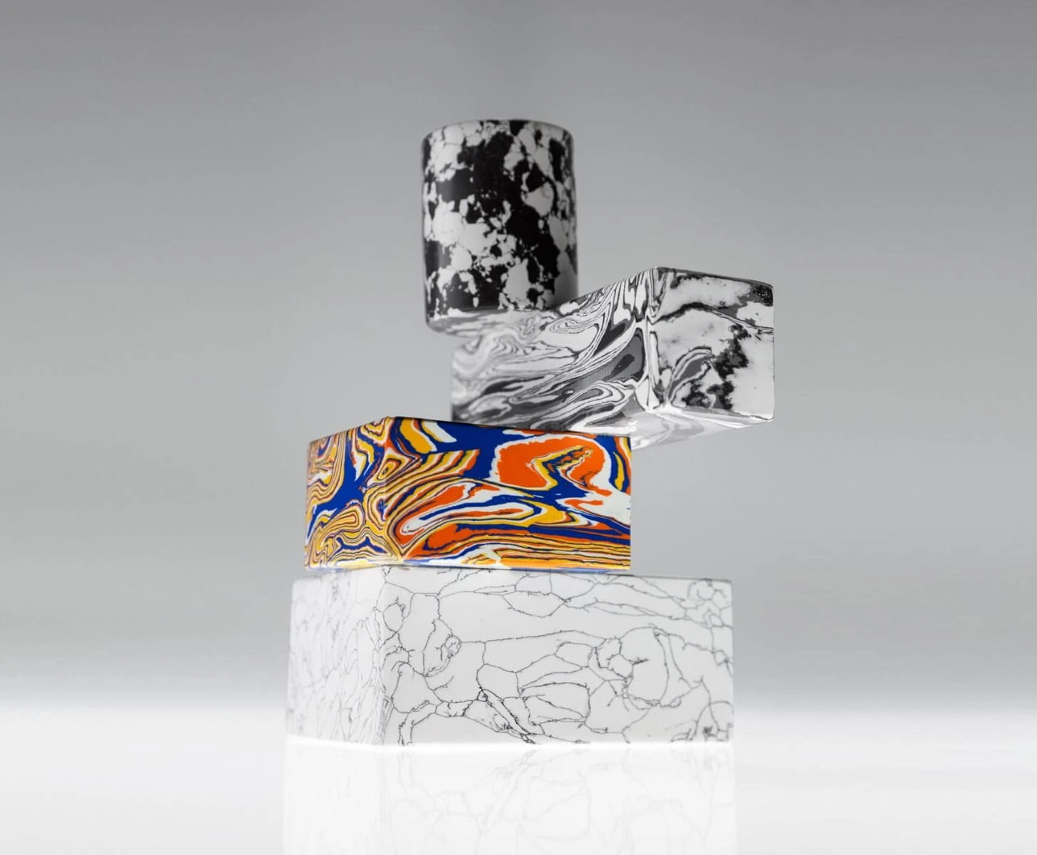 イタリアのポストモダニズムが持つ、美的センスや鋭い感性を、トム・ディクソンが持つサイケデリックなデザインフィルターを通すことで生まれたコレクション、「Swirl (スワール)」。幾何学的な物体を組み上げていくことで、多次元的で機能的な造形美が作りだされています。大理石の加工工場で発生する紛体状の端材に顔料や樹脂を混ぜ合わせ、ブロックとして成型されたものを加工し、新たなオブジェとして再生しています。