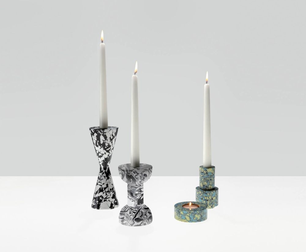 イタリアのポストモダニズムが持つ、美的センスや鋭い感性を、トム・ディクソンが持つサイケデリックなデザインフィルターを通すことで生まれたコレクション、「Swirl (スワール)」。幾何学的な物体を組み上げていくことで、多次元的で機能的な造形美が作りだされています。大理石の加工工場で発生する紛体状の端材に顔料や樹脂を混ぜ合わせ、ブロックとして成型されたものを加工し、新たなオブジェとして再生しています。