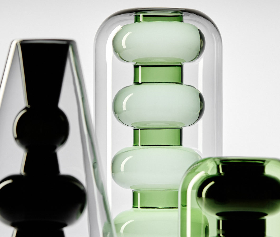 透明感のあるブラックとグリーンの配色で丸みを帯びたデザイン、花を活けるだけでなく置くだけでオブジェとしてもテーブルトップを華やかにします。