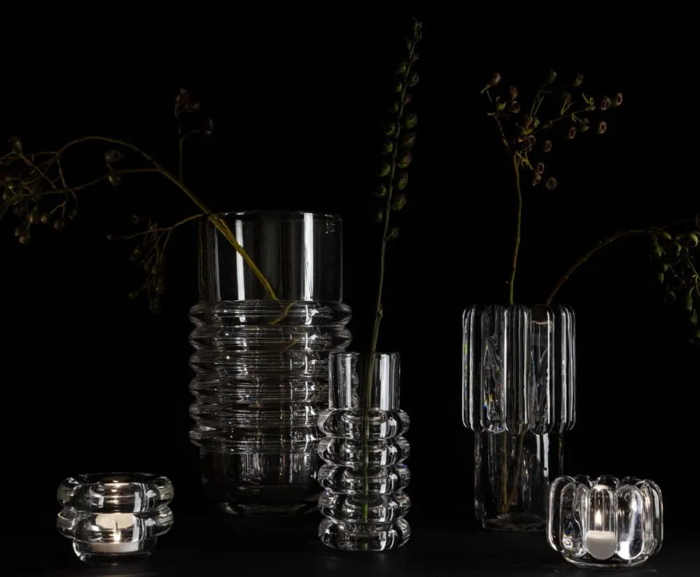 ひだ状のくぼみが重厚でインダストリアルな雰囲気を醸し出す、大胆なシルエットと簡素な機能美をあわせ持つグラス・アクセサリーのシリーズです。澄み切った透明感と厚みをあわせもつガラスをコイル状に巻いて成型したようなデザインが特徴です。 外から差し込む光を取り込み、屈折させることで、眩い光を放ちます。 摂氏1200℃に熱し、液体状にしたガラス原料を幾つかの金型に分け冷却、成形することで、無骨ながら、どこか親しみのあるシルエットが実現しました。