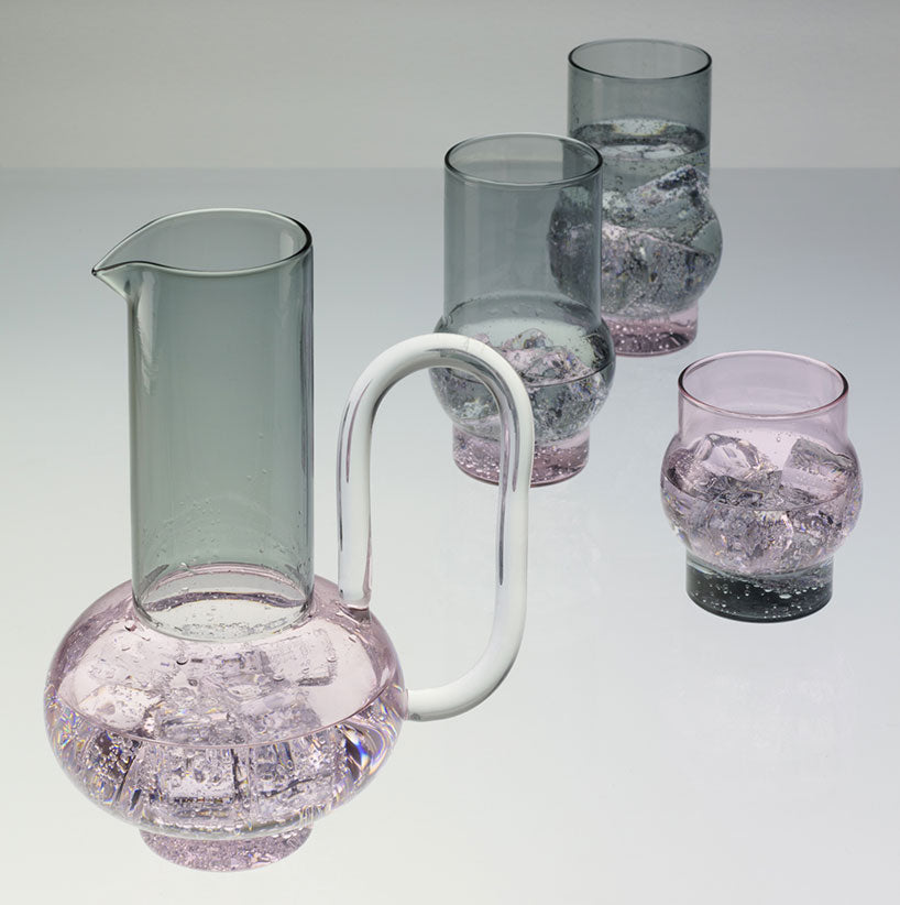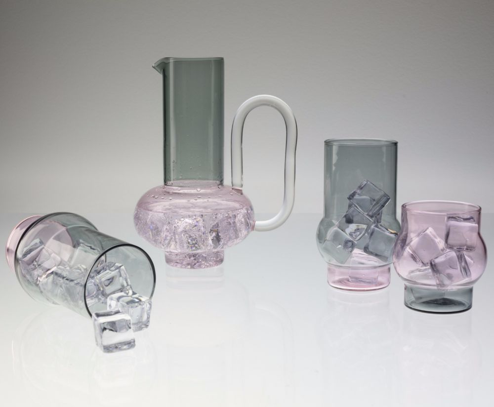 円錐と球、半透明と透明といった異なる要素を組み合わせることに焦点を当てたシリーズ「Bump」のグラス2脚セット。半透明のピンクとグレイという大胆な配色でテーブルトップを華やかにします。実験器具などに使用されることが多いホウ酸ガラスを使用し、軽量かつ熱にも強いため、普段使いにも適しています。