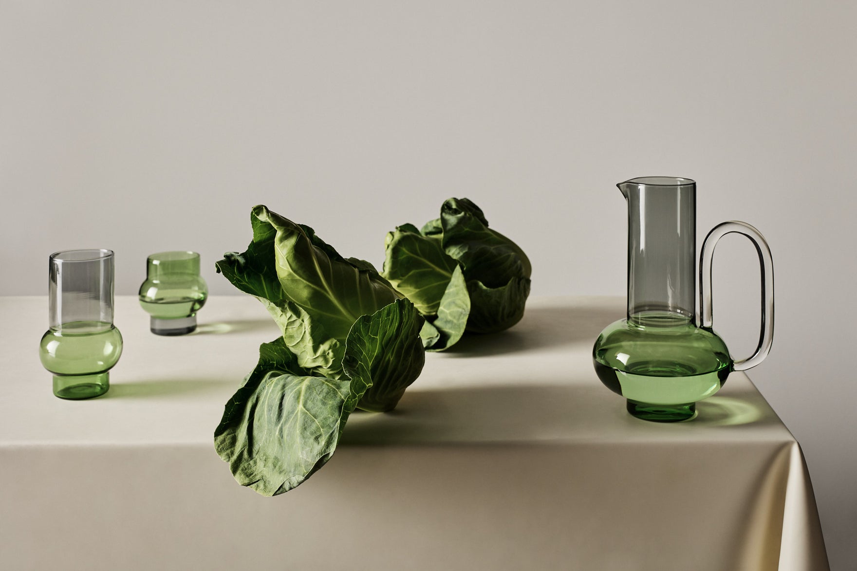 実験器具などに使用されることが多い軽量かつ熱にも強いホウ酸ガラスを手作業で吹き出し、グリーンとグレーの絶妙な色調の半透明さを表現しています。