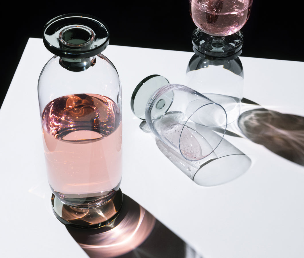 全体的にミニマルなデザインでありながらも、ぽってりとした重厚感を持つPUCKシリーズは、その見た目のインパクトからの想像を超え、プロのバーテンダーの方の手にもなじむような機能性を備えています。灰色がかったスモークカラーに色付けされたガラスを、熟練した職人が一つ一つ仕上げています。ミネラルウォーターやお気に入りのドリンクを入れるだけでいつもの食卓を華やかにします。
