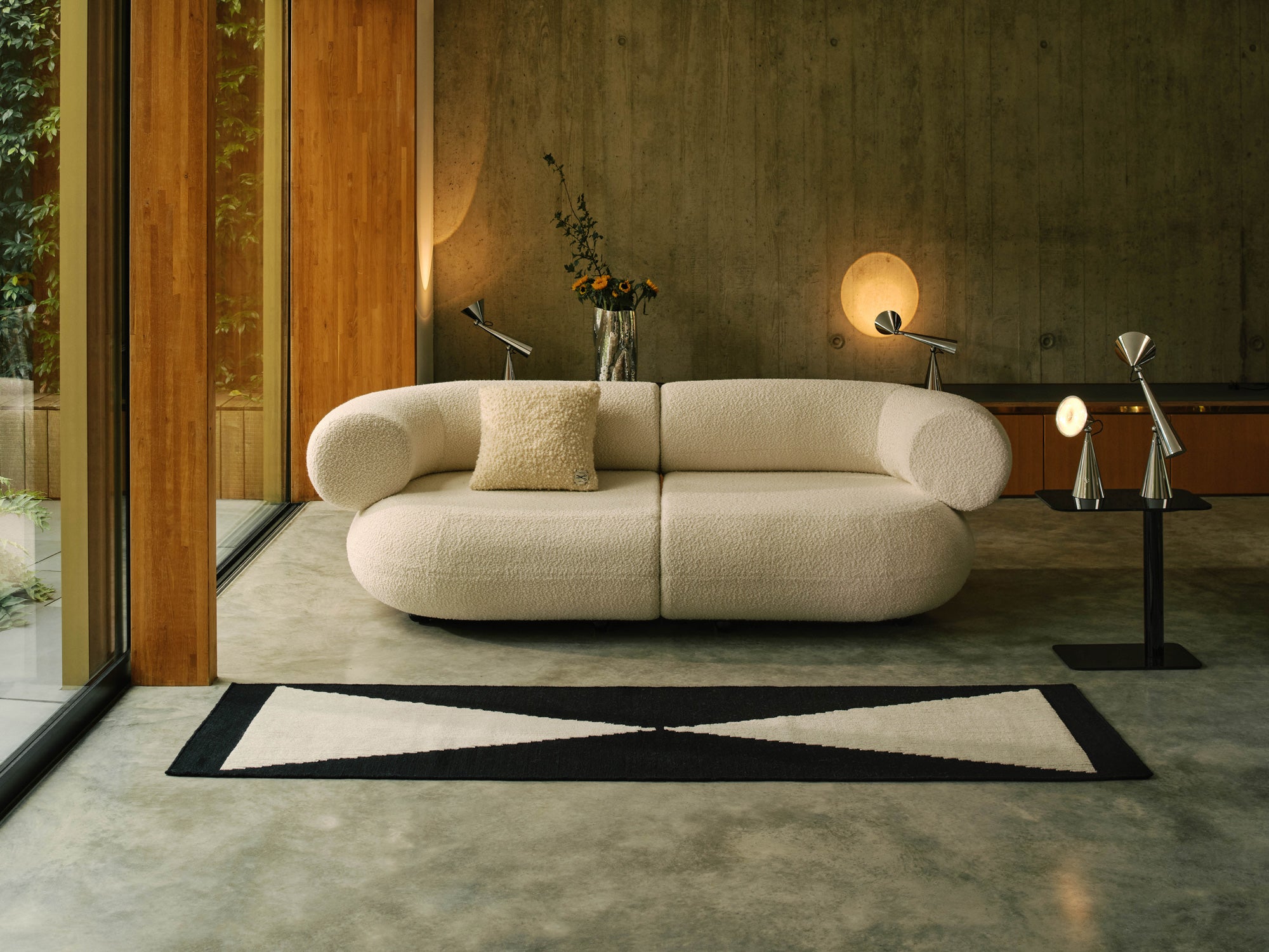 WEAVE RUG(ウィーブ ラグ)は、伝統的なバスケットウィーブ(籠編み)柄を大胆に拡大し、印象的なアウトラインを加えることで再解釈したラグ。