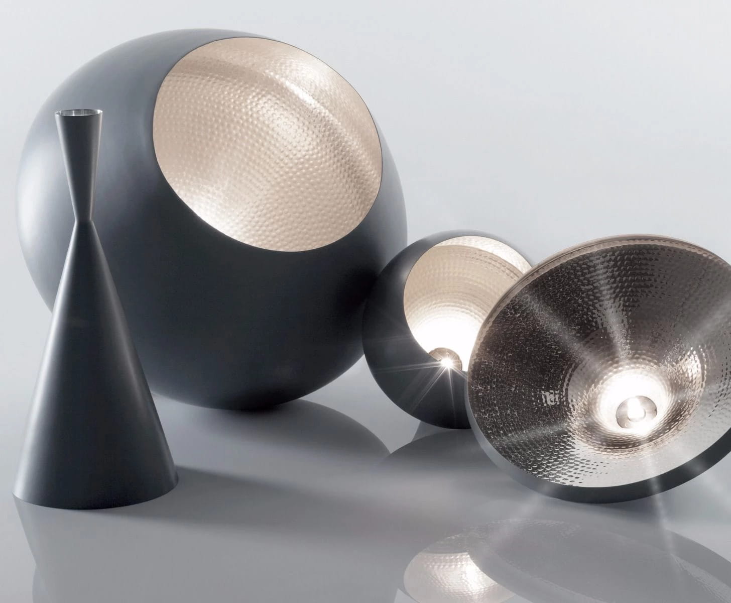 この製造工程で創り出されるr(曲面)やbeat(打痕)の形状に一つとして同じものはなく、細かいゆがみや小さな凹みも個々の製品に刻み込まれる職人のフィンガー・プリントであり、それこそがBeat Lightがハンドメイドである証とも言えます。個体によっては多少の色ムラが発生しますが、陶器の釉薬と同様、制作時の環境によって作り出される天然のデザインとも言えます。
