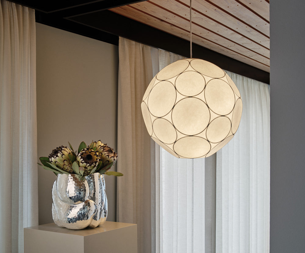 日本の和紙照明を思わせるどこか懐かしい柔らかさと、スチールフレームによる幾何学的な構造が融合し、デザイン全体にモダンなエッジを与えています。