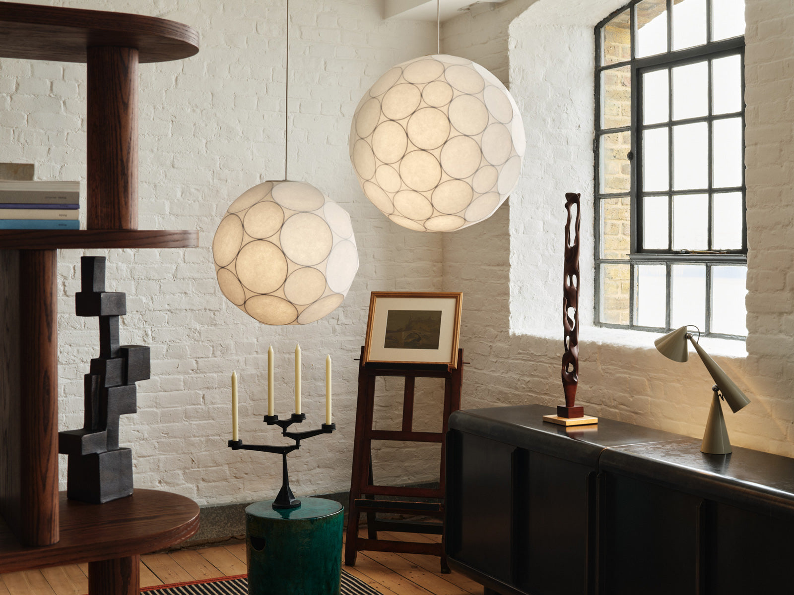 日本の和紙照明を思わせるどこか懐かしい柔らかさと、スチールフレームによる幾何学的な構造が融合し、デザイン全体にモダンなエッジを与えています。