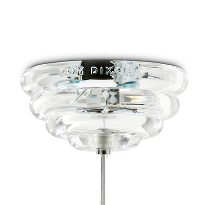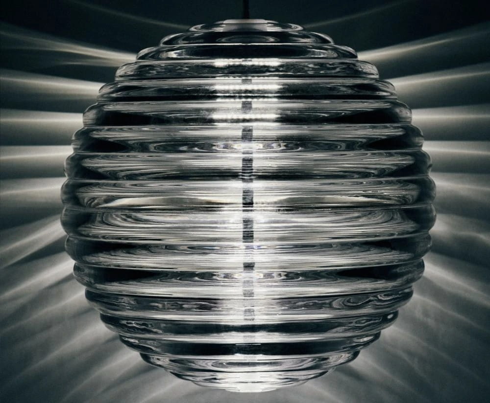 大胆なシルエットとシンプルな機能を持つPRESSは、1200℃の溶融ガラスを大量に滴下し、鉄の金型で何トンもの圧力をかけてプレスして製造され、非常に耐久性の高い照明器具を作り出しています。